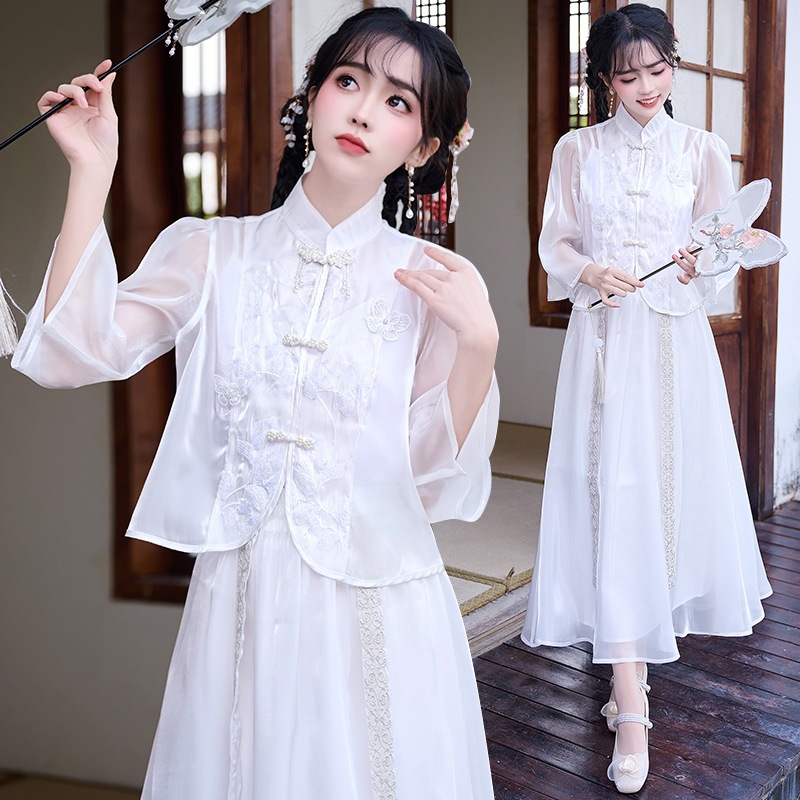 実写新中国式立襟盤留めジャカード刺繍網糸中袖改良ストラップ漢服復古スカートセット