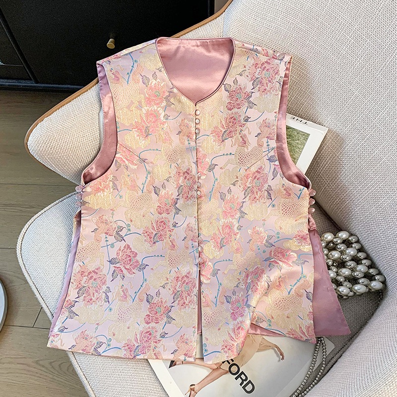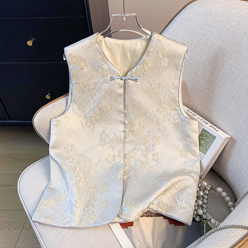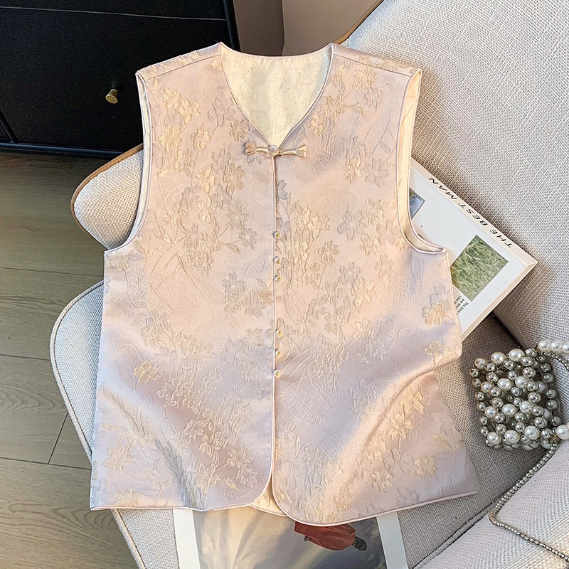 新しい中国風の古代衣装スタイルのレトロな改良されたバックルサテンジャカード刺繍漢服唐スーツベストトップのリアルショット