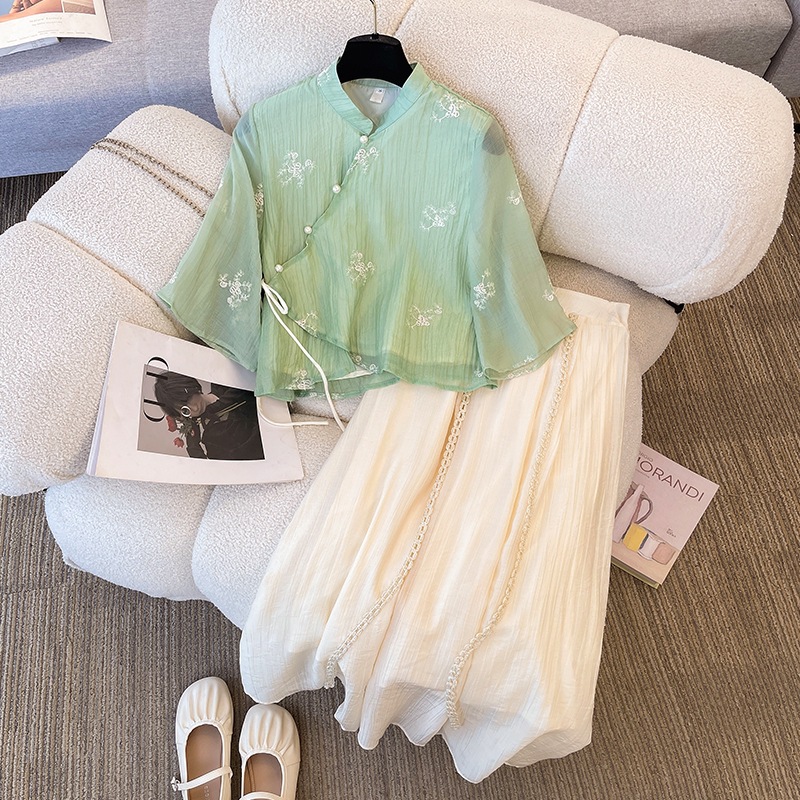 実拍新中国式改良漢服国風刺繍斜襟気質立襟盤ボタン上着と半身スカートセット