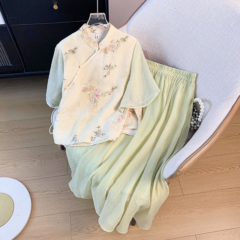 実写新中国風中国風中袖ストラップ立襟盤ボタン斜襟改良復古上着スカート2点セット
