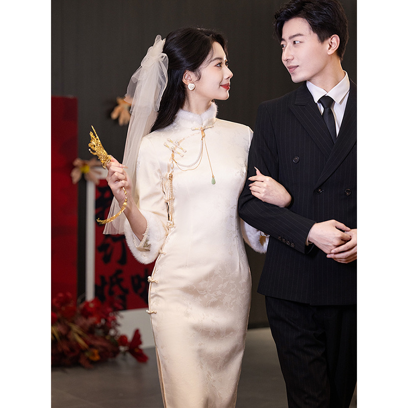 白いチャイナドレス2024新中国式婚約領収書登録ドレス冬にベルベットの白いスカートが女性の長袖に戻った