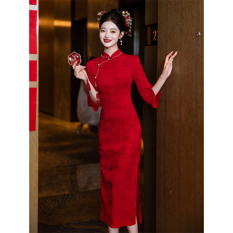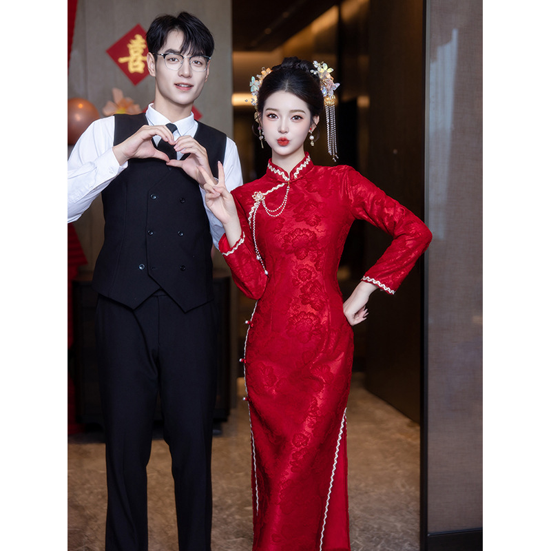 敬酒服花嫁チャイナドレス秋冬長袖2024新赤色改良ジャカード新中国式結婚婚約ドレス