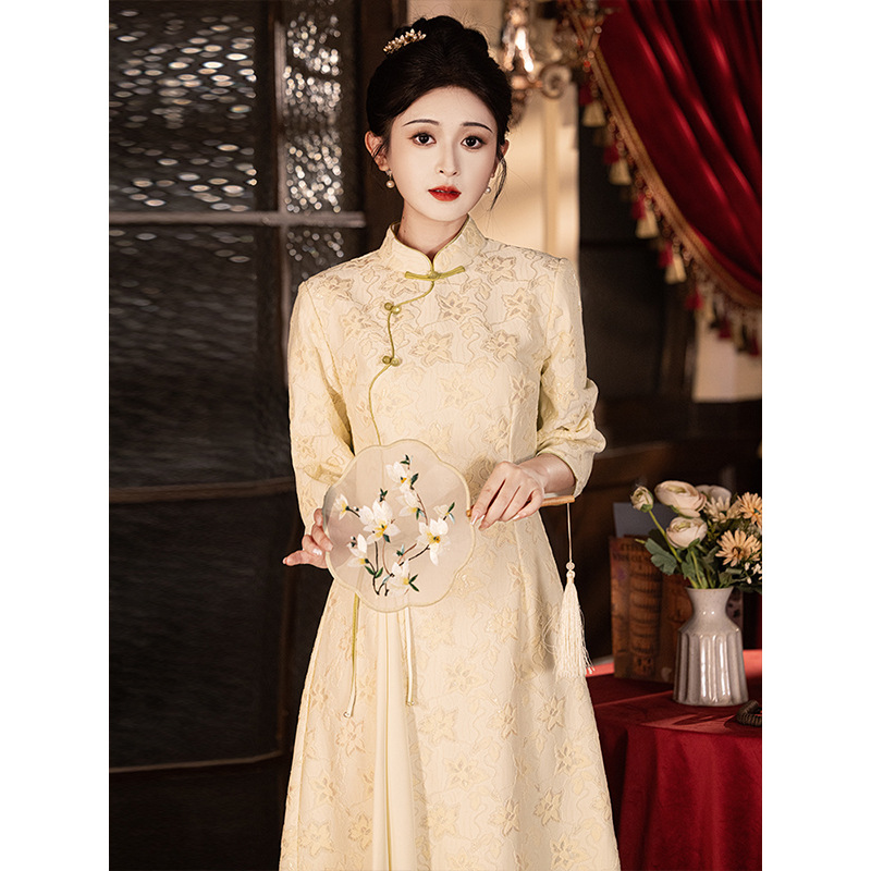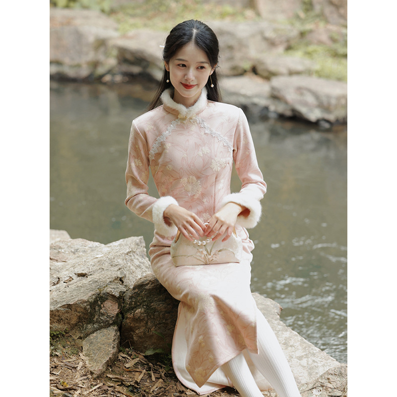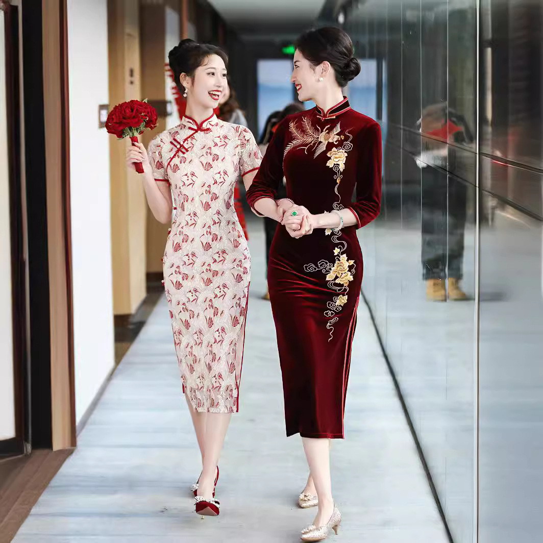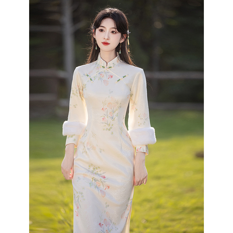 秋冬チャイナドレス日常婚約復古改良新中国式2024新双袖とベルベットのロングワンピース女性