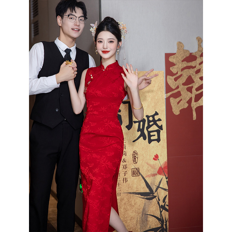 赤いチャイナドレス女性2025新型夏新中国式改良若いタイプの少女袖なし清冷感高級大気