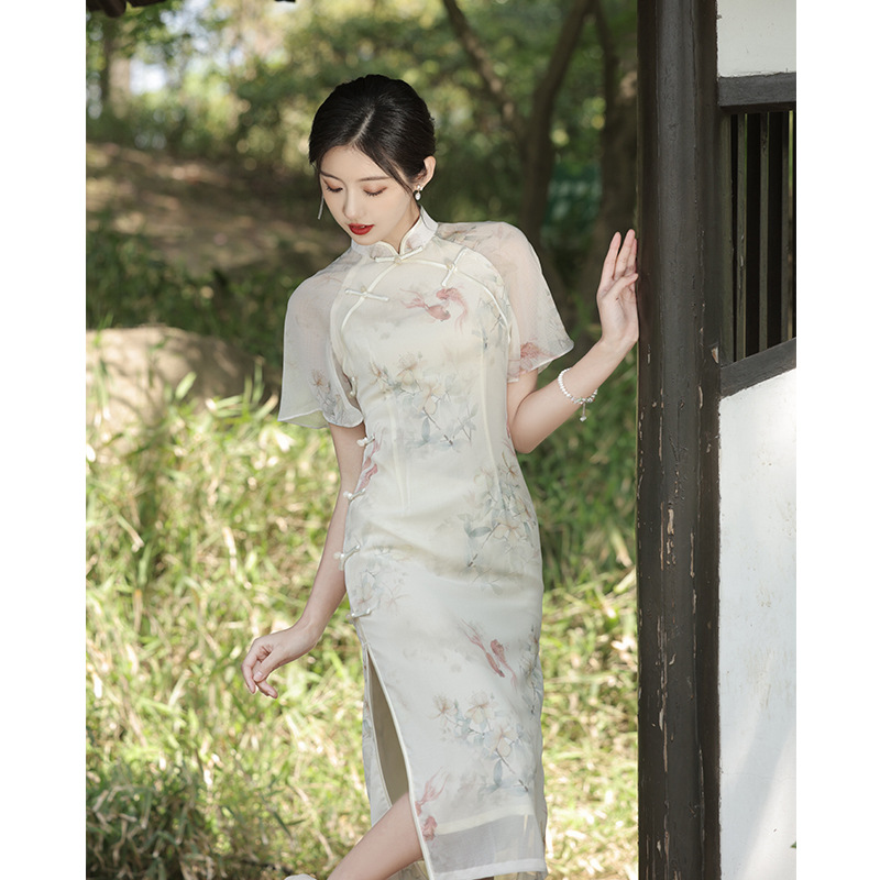 新しい中国のチャイナドレスの女性の夏のシフォンのワンピースは優雅に若いタイプの少女の気質を改良して、普段は丸い襟を着ることができます。