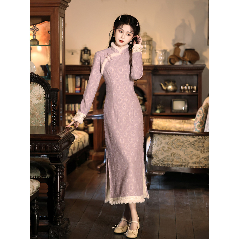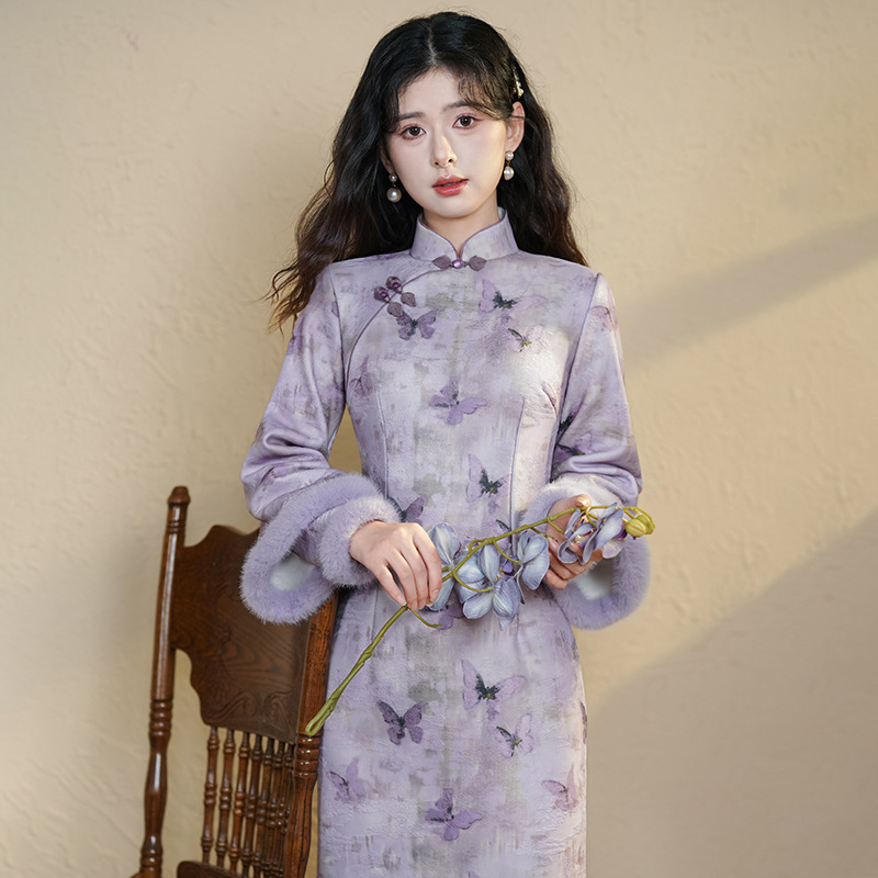 紫色のチャイナドレスの新モデル2024秋冬のベルベットは、新中国式のレトロな絶美を厚くして冬の国風冬を改良した