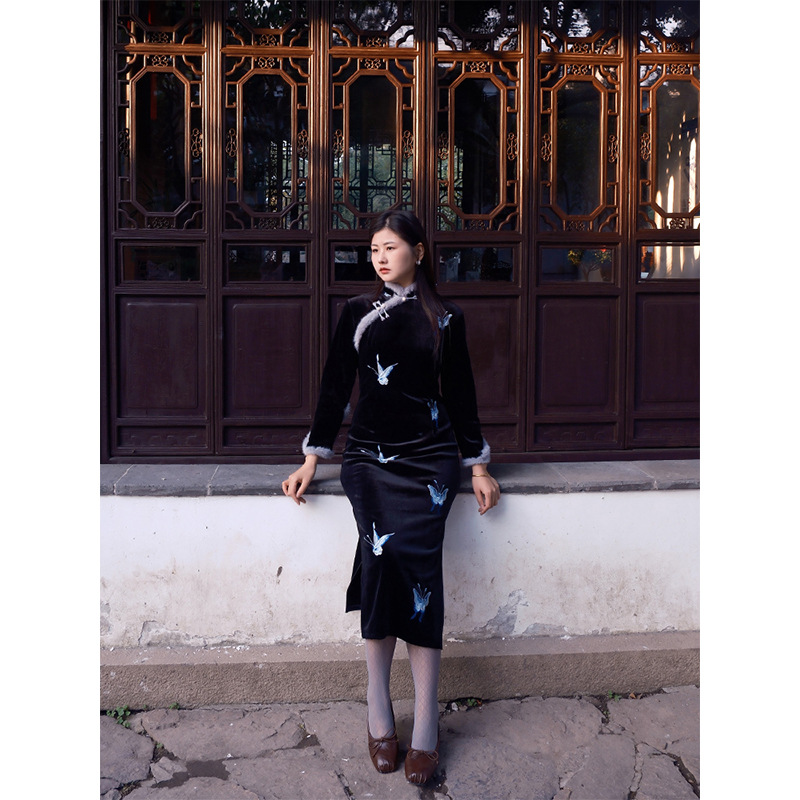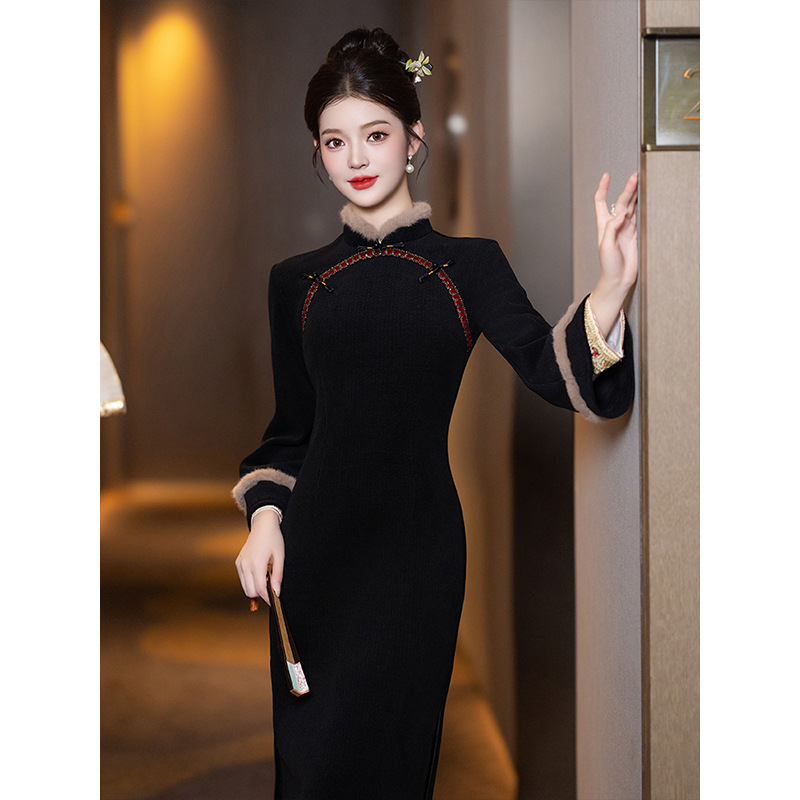 黒いチャイナドレス2024新型高級修身秋冬長袖ベルベット増厚改良女性新中国式倒大袖