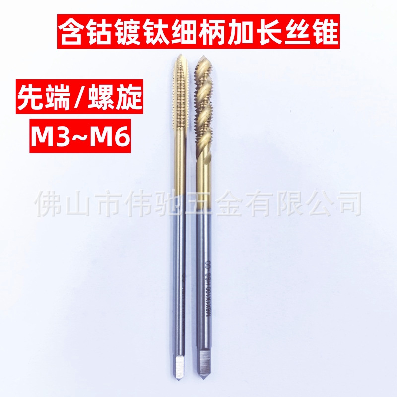 コバルト入りチタンメッキロング小柄タップ先端スパイラル細柄縮柄HSS機用TINステンレス用シルクタッピングCO