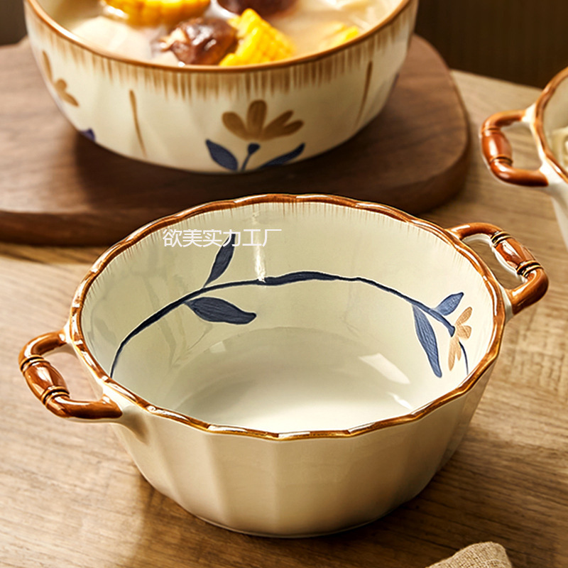 新商品の釉薬の下で彩の双耳のスープの碗の新しい中国式の家庭用の陶磁器の大きいスープのたらいのインチの大きいサイズの泡の碗の大きい玉の沁み