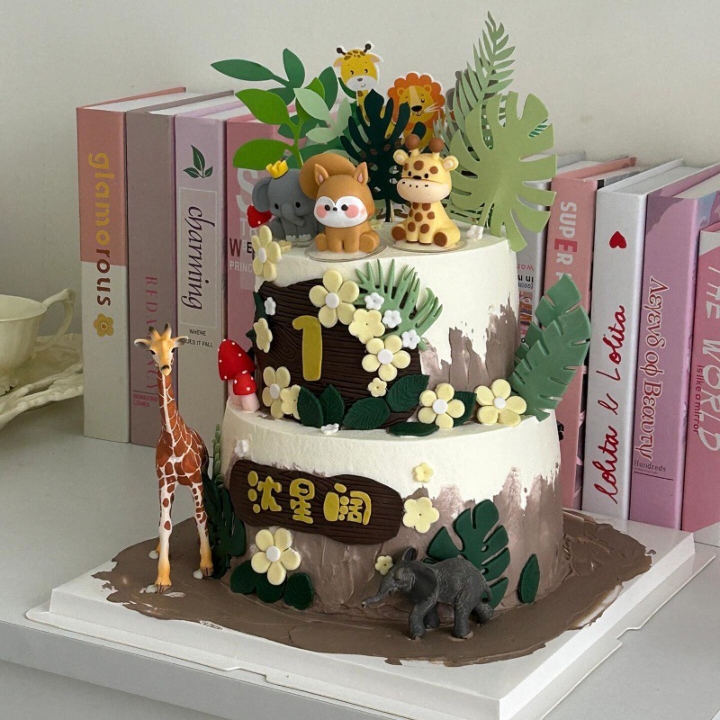 森の動物をテーマにしたケーキデコレーションオーナメント動物園キリンライオン象子供の誕生日ベーキングデコレーション