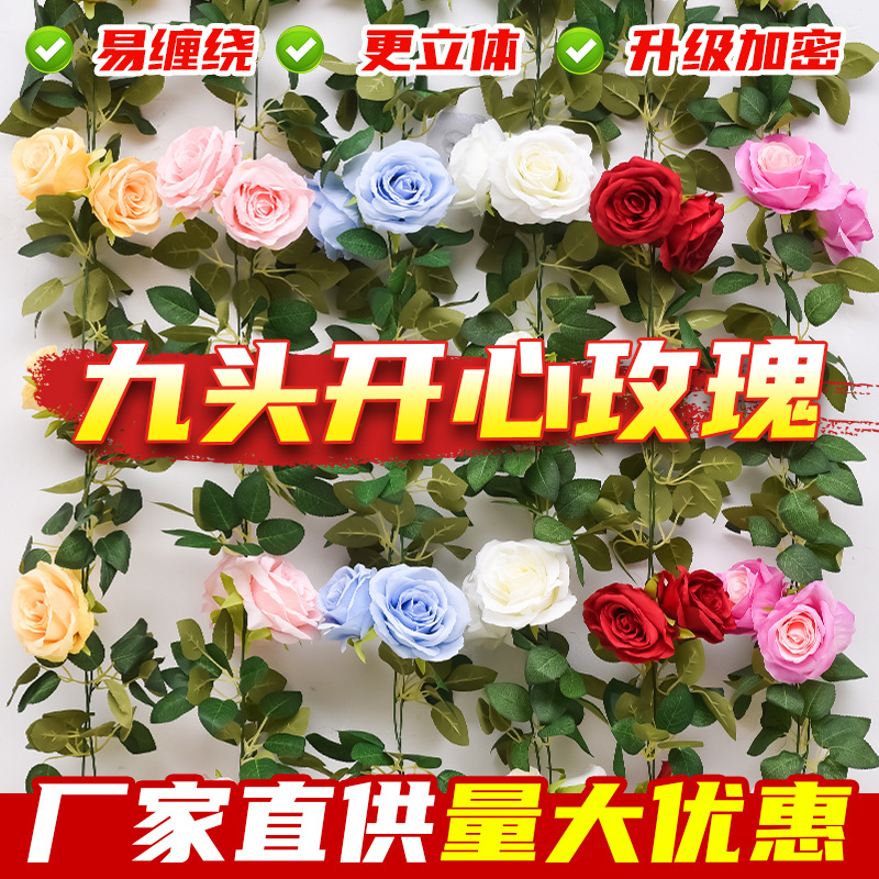 批发仿真开心玫瑰花藤蔓假花绿植室内吊顶空调管缠绕婚庆装饰玫瑰