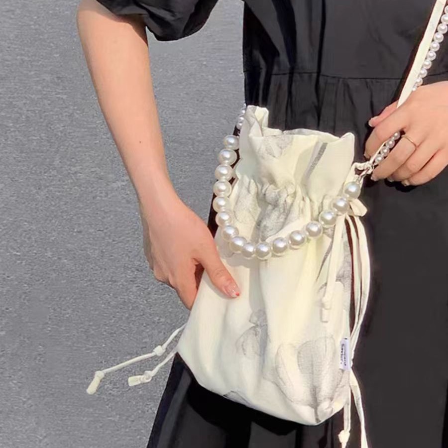 千羽鶴小衆中国式miniキャンバスバッグ引き紐女性真珠チェーンバッグ国風斜めショルダーバッグビーズバッグ
