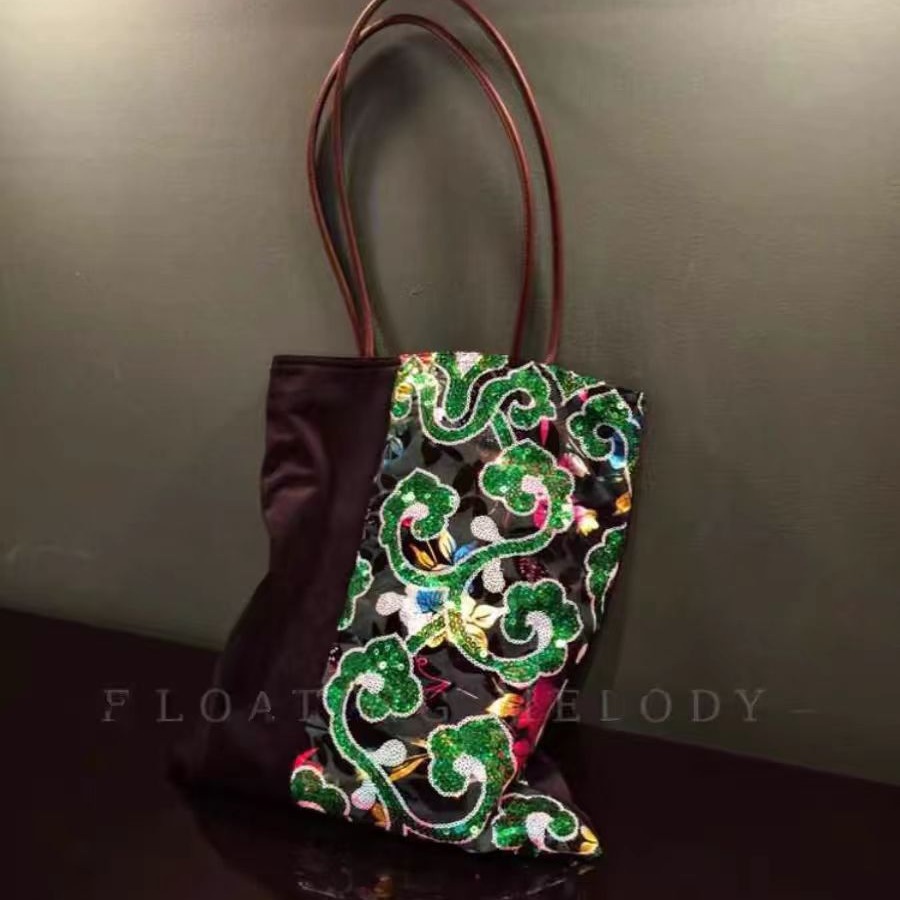 古着感ヴィンテージグリーン祥雲スパンコールベルベットステッチシングルショルダーバッグ特包浮月笙オリジナル新商品
