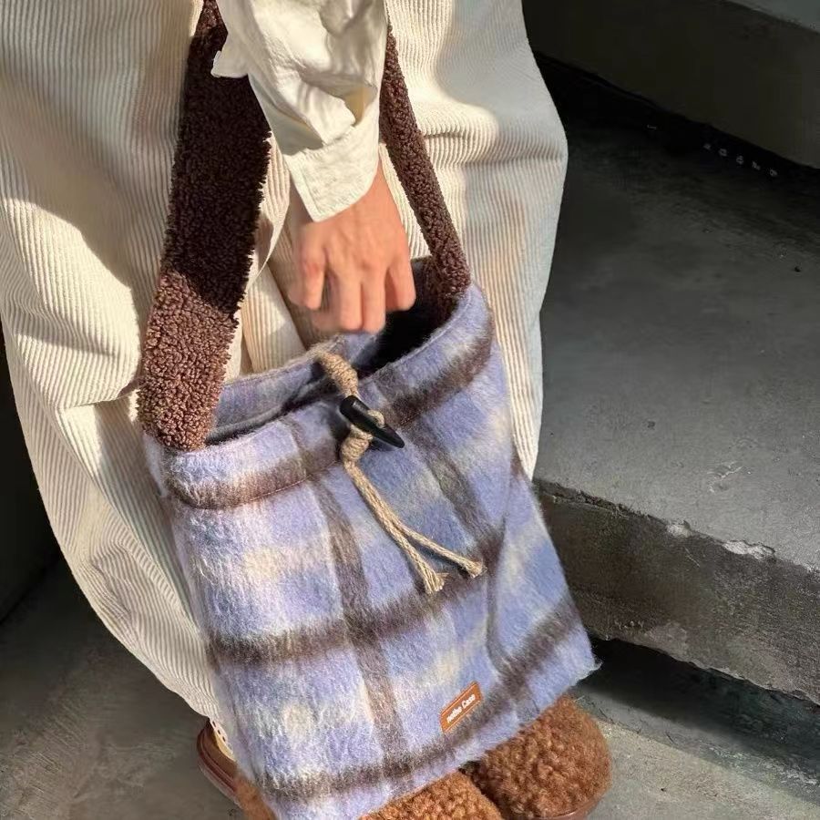 卸売女性バッグ秋冬2023新作ウール格子縞大容量トートバケツバッグ小毛小衆ショルダーバッグ