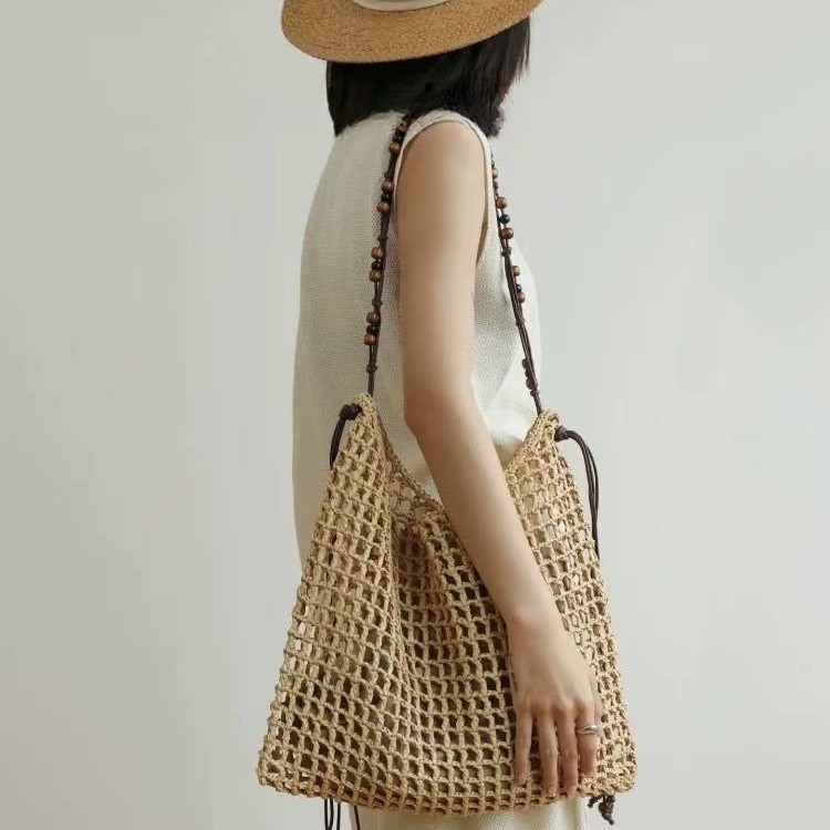 夏休みスタイルわら手織りトートバッグラフィア中空バッグレディースショルダーポータブル大型バッグ大容量