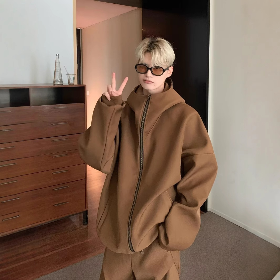 冬の大衆デザインの帽子付きコート男性2024新型のゆったりしたシルエットのカーディガン高級感のあるスポーツジャケット