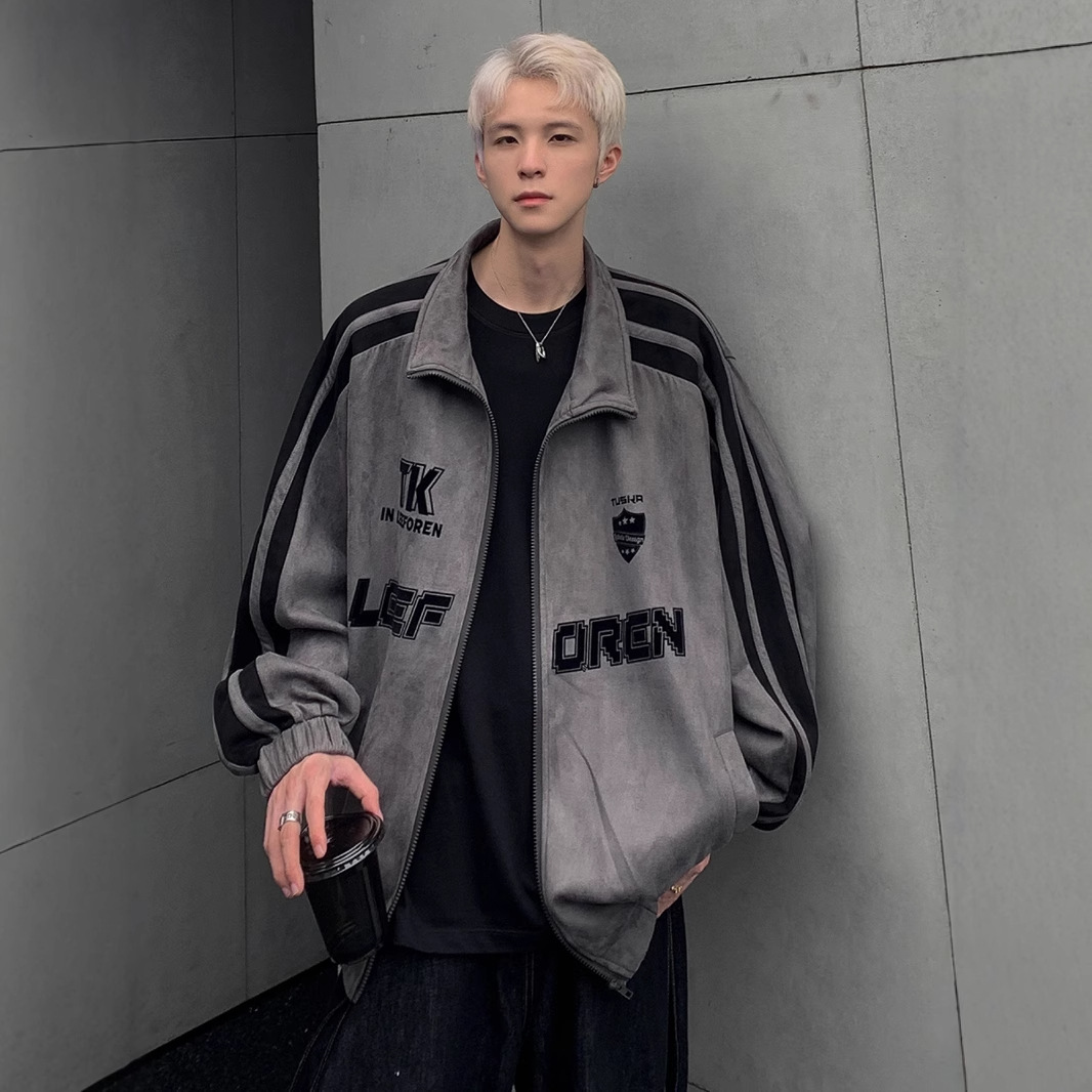 サイドストライプの野球服の男性の金の2024秋冬の新型のアメリカのスエードのスポーツジャケットの高い街のごろつきのかっこいいコート