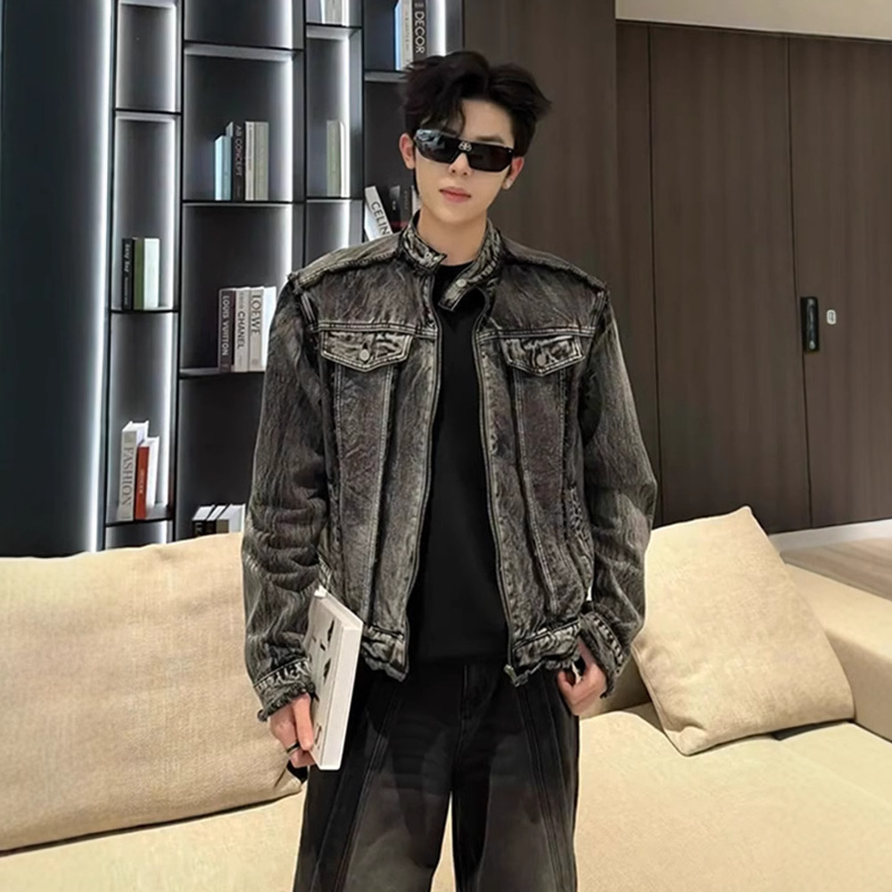 肩の水洗いデニムのコートは男性モデルの高級感があります。
