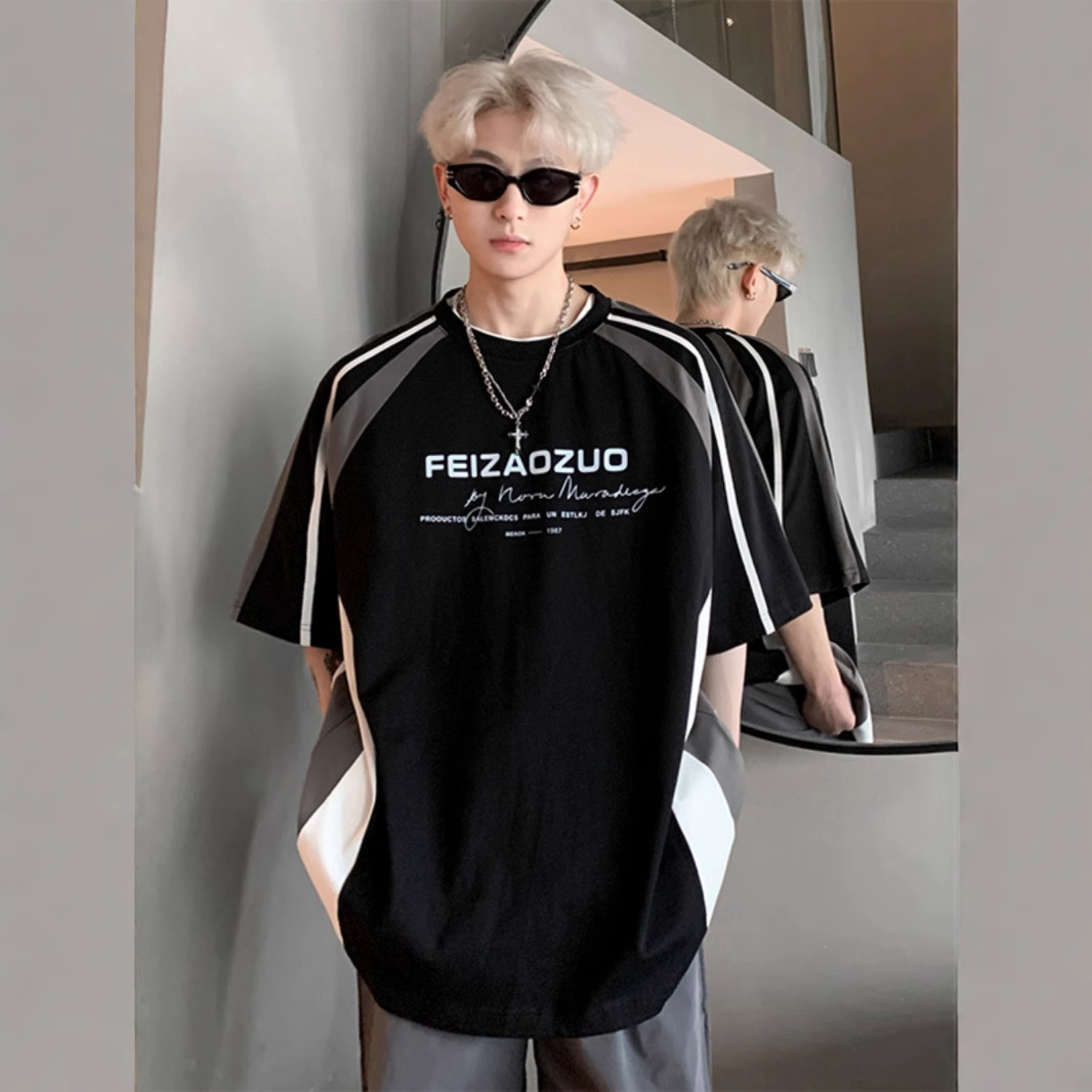 半袖tシャツ男2025夏アメリカ式高街潮牌痞帅機関車風縞つなぎゆったり半袖服