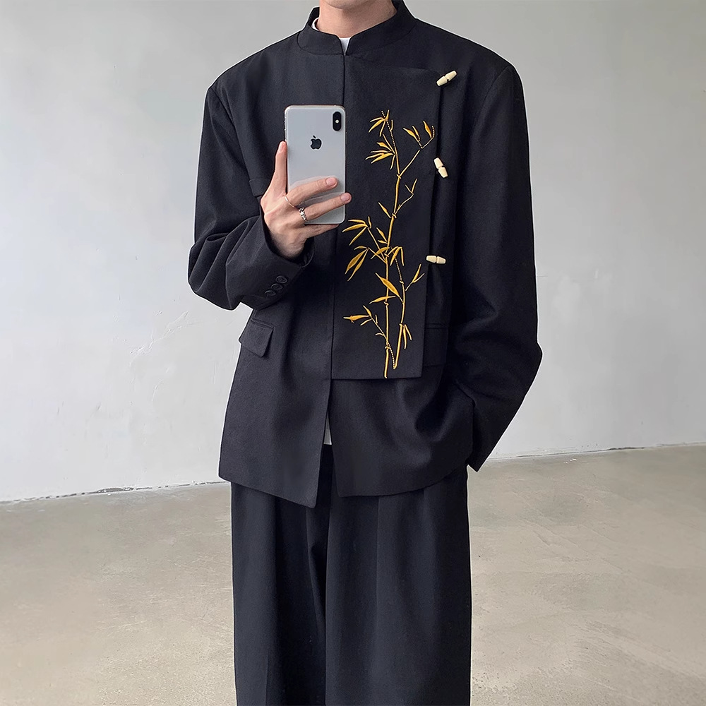 新中国式国風メンズ黒金竹刺繍スーツジャケット春秋高級感痞帅中山服ジャケット