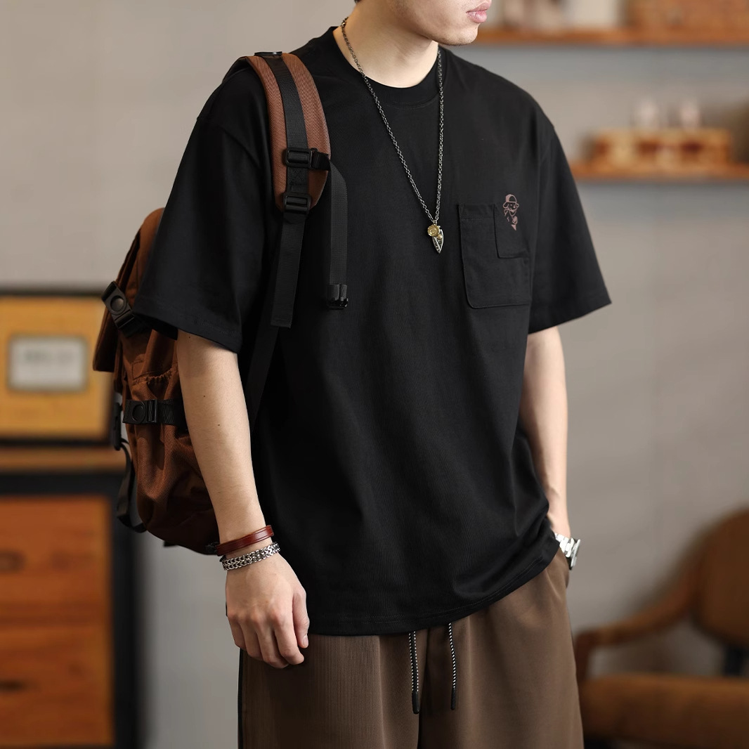 アメリカのファッションブランドのポケットのプリントの半袖のtシャツの男性の夏のゆったりしている重ポンドの純綿の丸首の半袖のtシャツの上着