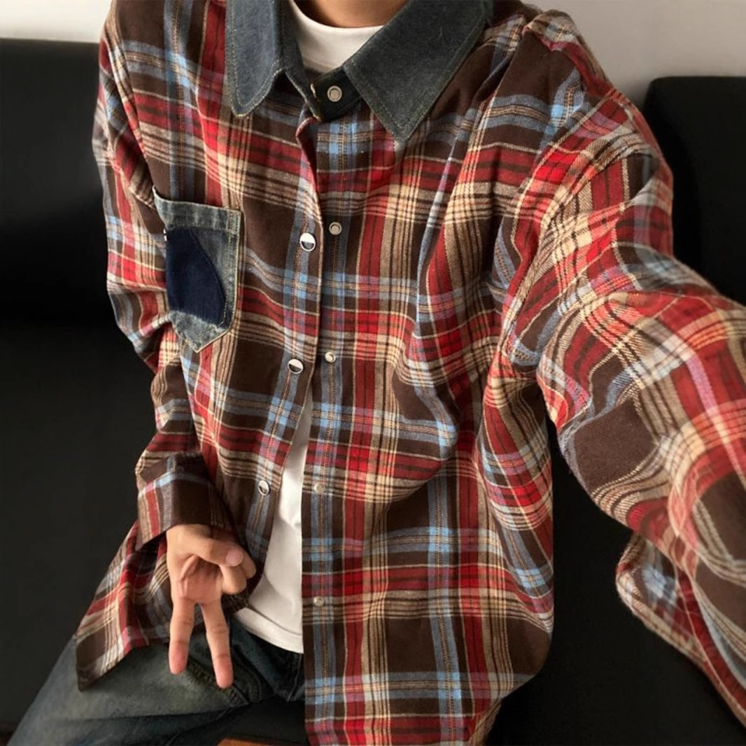 アメリカのレトロな長袖の格子のシャツの男性の春秋はファッションの札のカップルを掛けてデニムの襟の黄色の格子縞のコートをつなぎます。