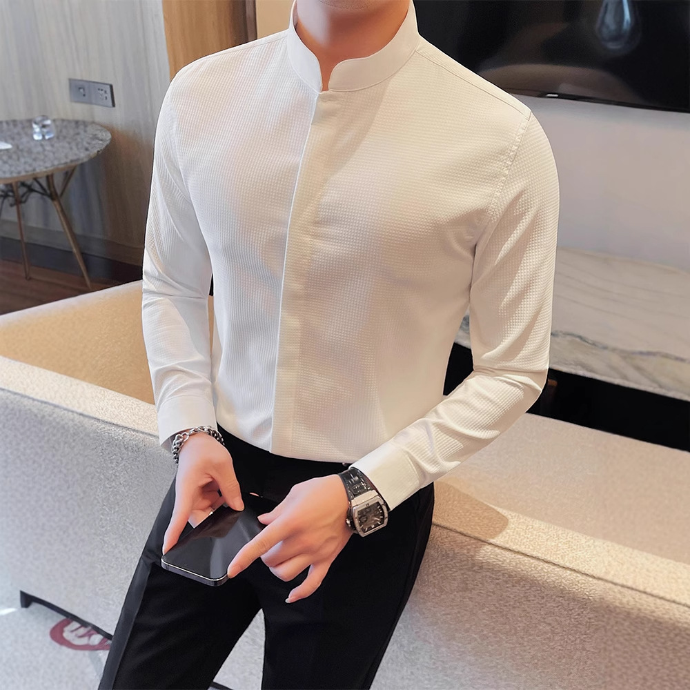 立襟シャツ男性長袖2025新中国式国風メンズ高級感中山服白シャツ男性モデル