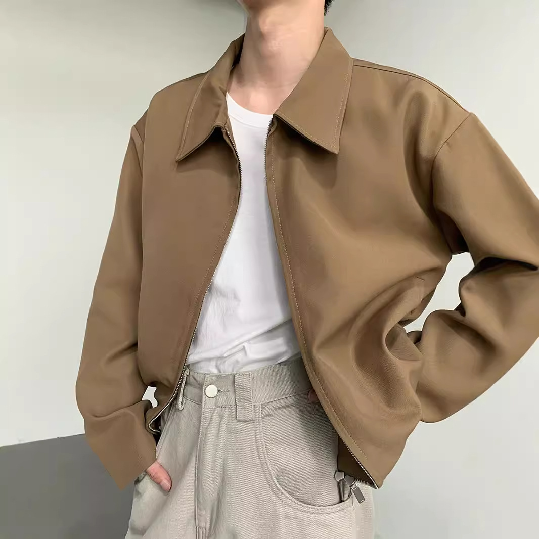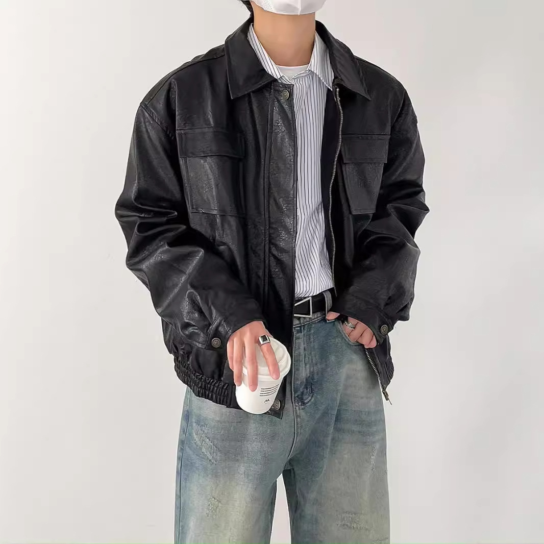 2024秋冬の韓国版のファッションのレトロな色は古いpu機の車の風の皮の服のコートの男性のゆったりしている襟のジャケットを拭きます。