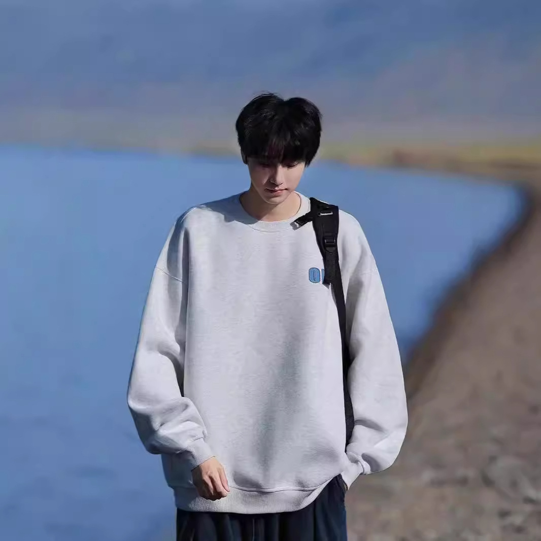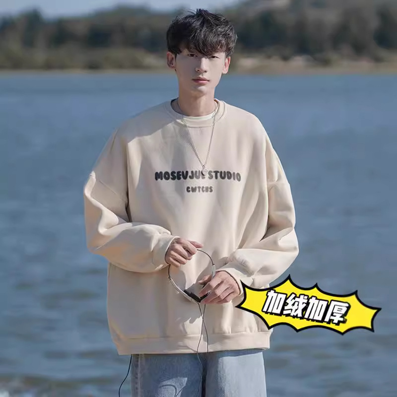 メーカー直供420g重ポンド純色丸首衛衣男春秋金日系潮牌ゆるい帽子なしコート