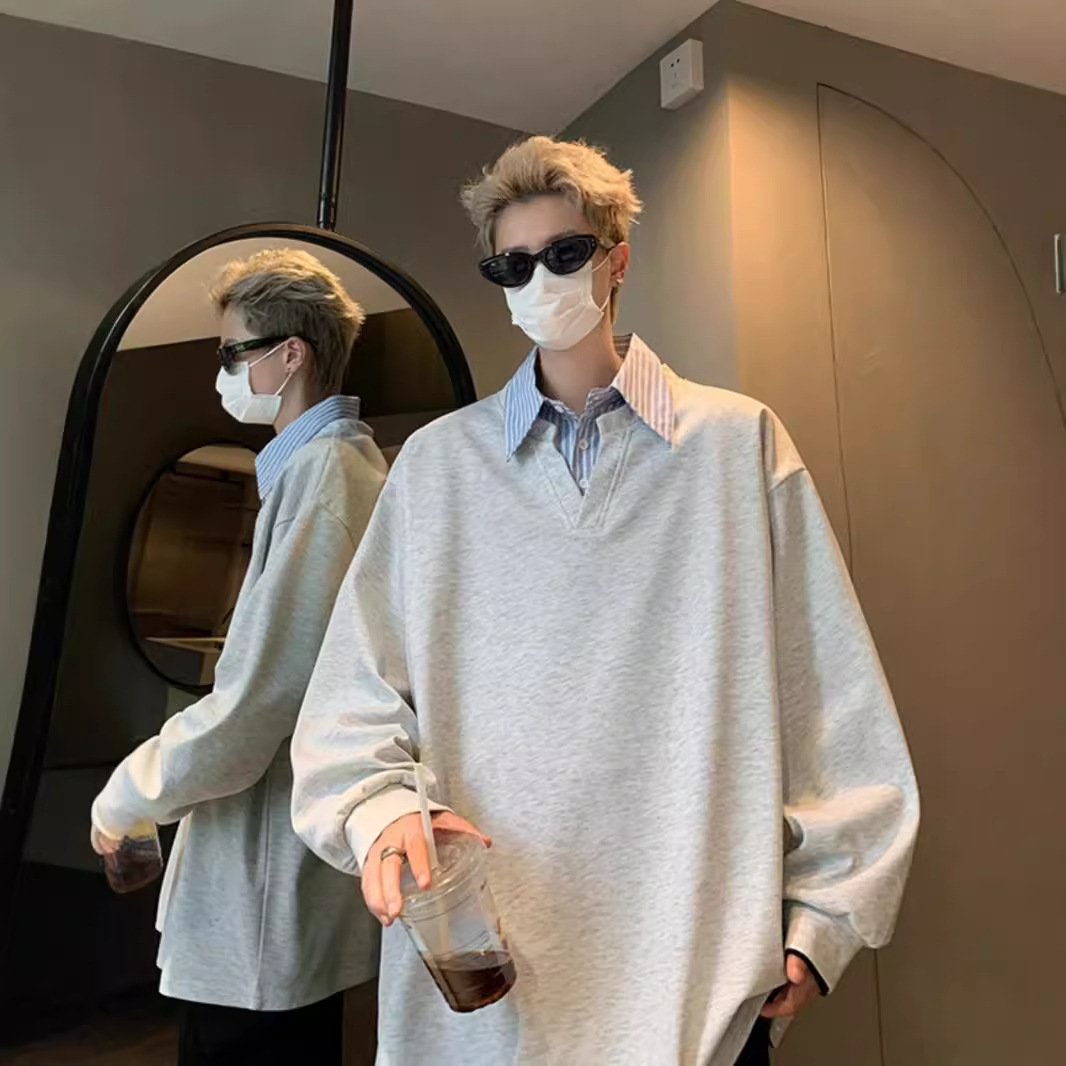 シャツの襟の偽の2つのパーカーの男性の春秋学院の風の小さい大衆のカジュアルな長袖のtシャツのファッションのブランドのゆったりしている大きいサイズの上着