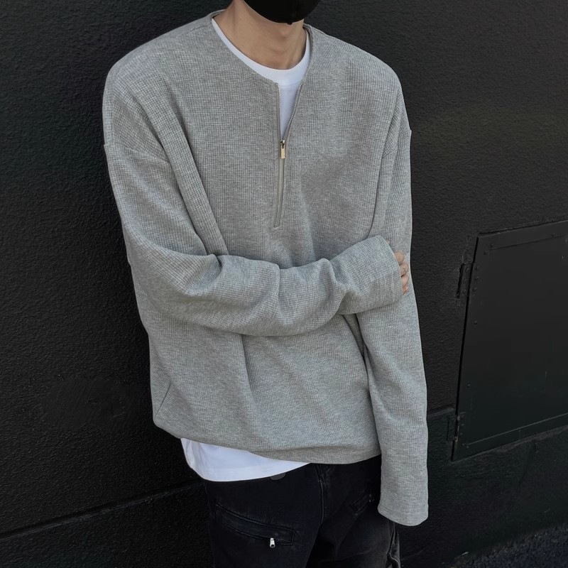 ワッフル半ファスナー長袖tシャツ男性秋ファッションブランドアメリカ高街丸襟スウェットゆるいカジュアルシャツ