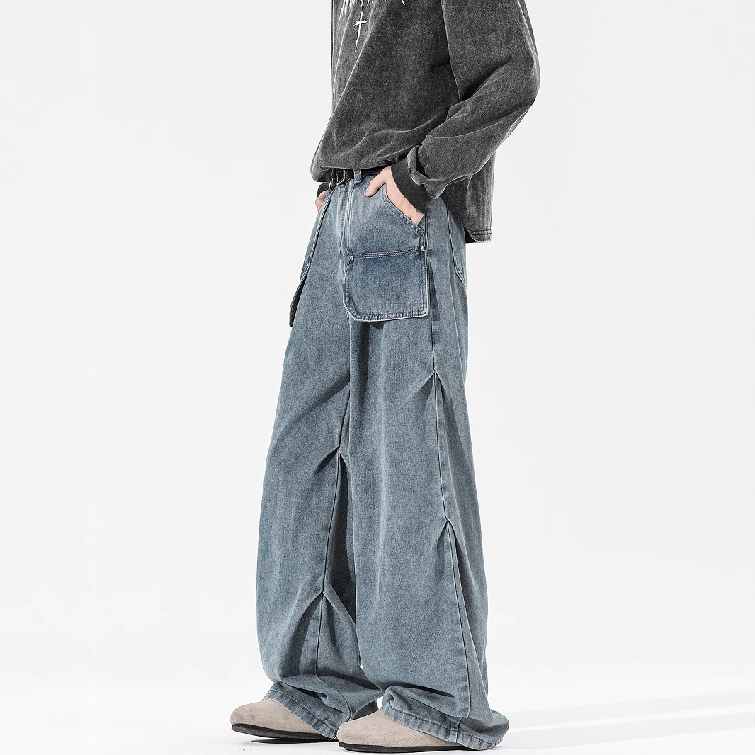 不規則なしわのデザインのズボンの男性の2025新型の春と秋のアメリカ式のcleanfitの水洗いの大きい足のジーパン