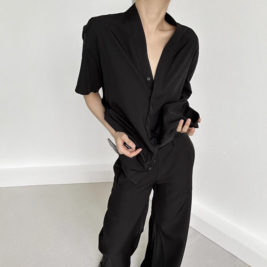 黒vネック禁欲系半袖シャツ中性風男女モデル2025夏高級感氷糸痞帅シャツ