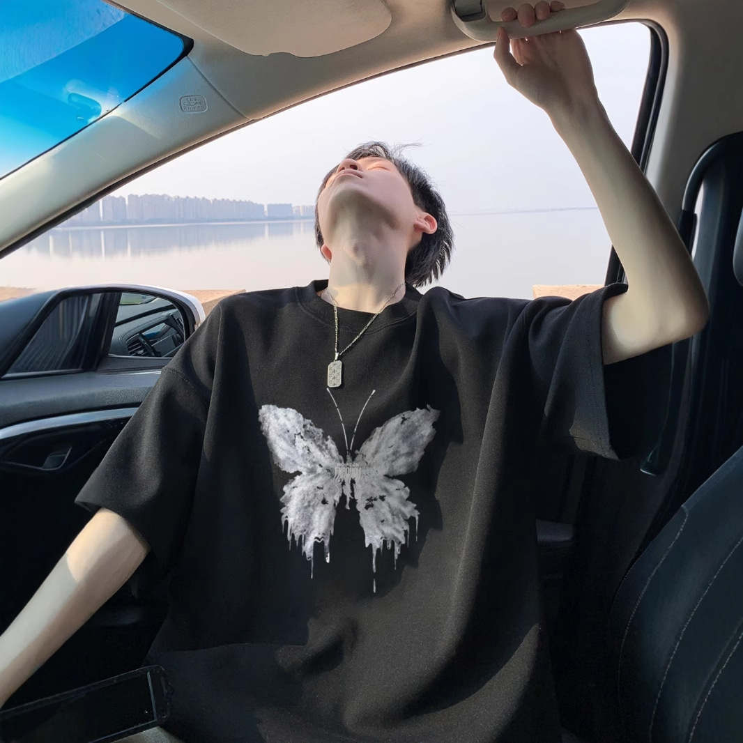 アメリカのレトロ半袖tシャツ男性夏2025新型蝶プリントのごろつきがゆったりしています。
