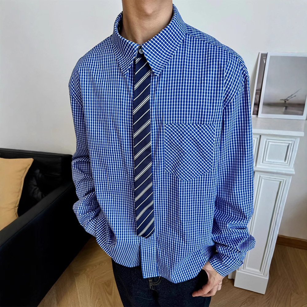 ブルー偽2枚ネクタイ格子シャツ男性春高級感デザイン感シャツアメリカ式cleanfitコート