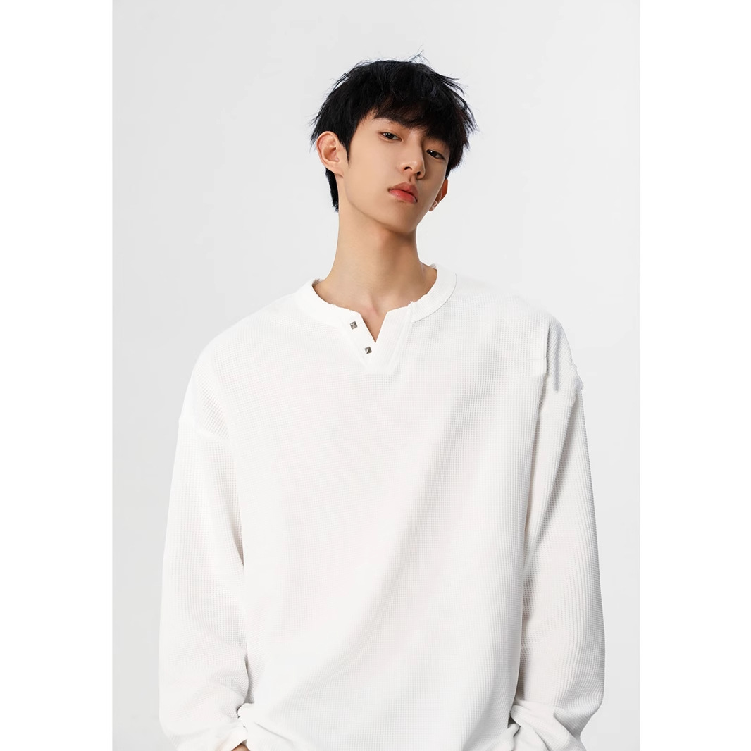 小さいvネックのリベットのワッフルの長袖のtシャツの男性2025春の新型の重いポンドの青少年のゆったりしている頭の上で服をかぶせます。