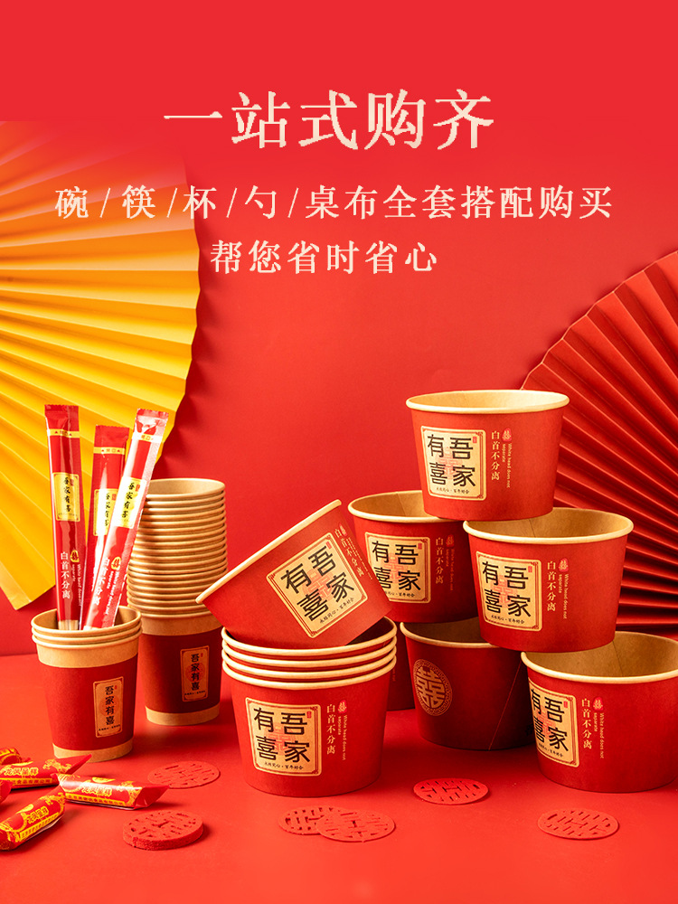 結婚喜碗厚手の赤い丸い紙碗結婚式の酒席の碗の箸の披露宴用紙コップの使い捨て食器セット
