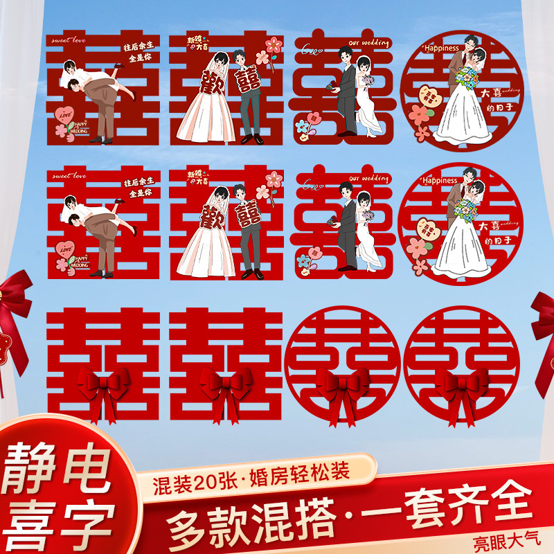ハッピーワードステッカー静電ステッカーワインレッド結婚式特別な窓ガラス窓ステッカー囍ワードウェディング用品結婚式の部屋の装飾