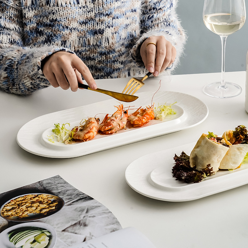 レストランの陶磁器の食器の寿司の皿の商用のアイデアの流砂の楕円形の洋食の皿の長い皿の軽食は皿を並べます。