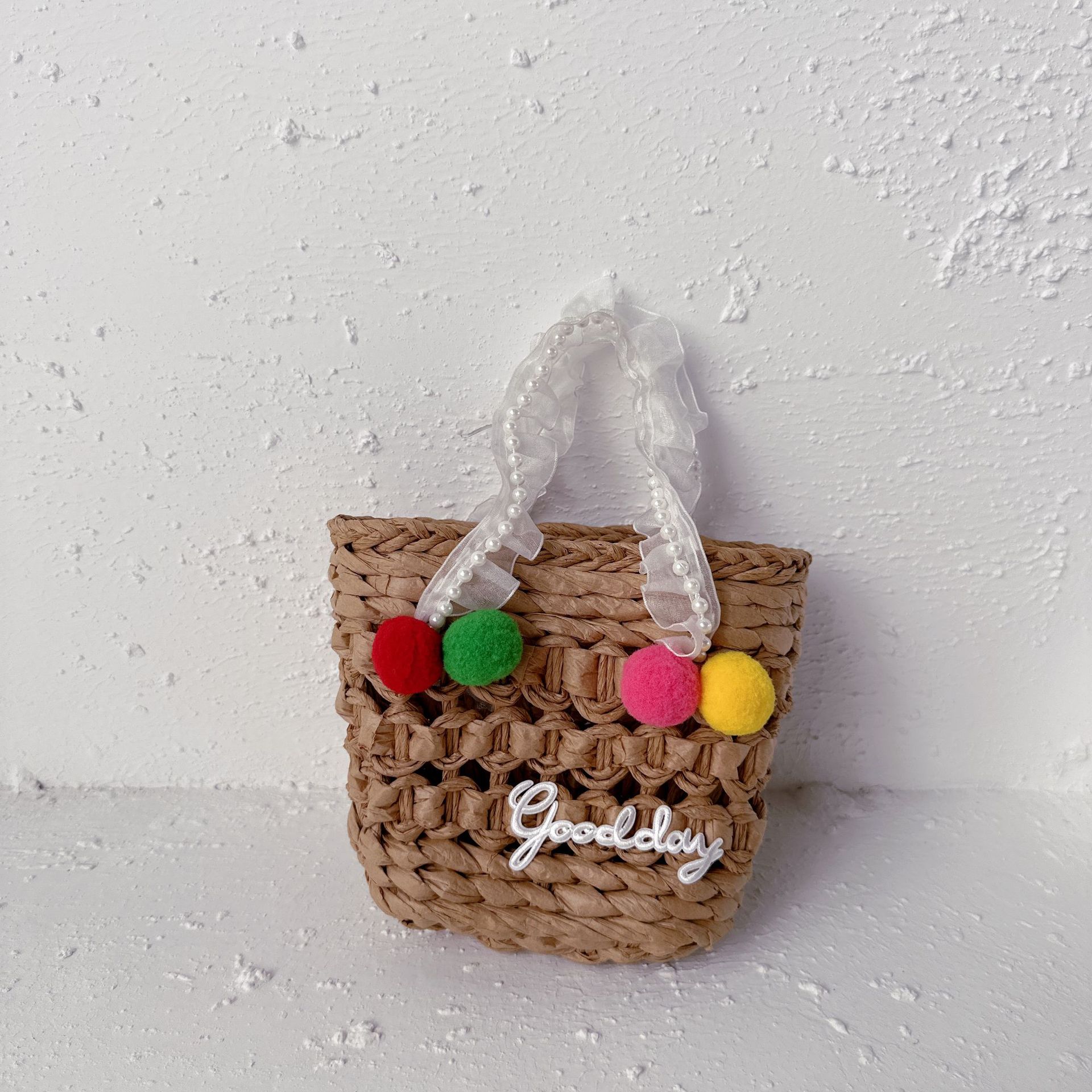 かわいい草の編みの子供のカバンのカラーの毛のボールはハンドバッグの洋風の民族の風の女の子の春の旅行を編みます。