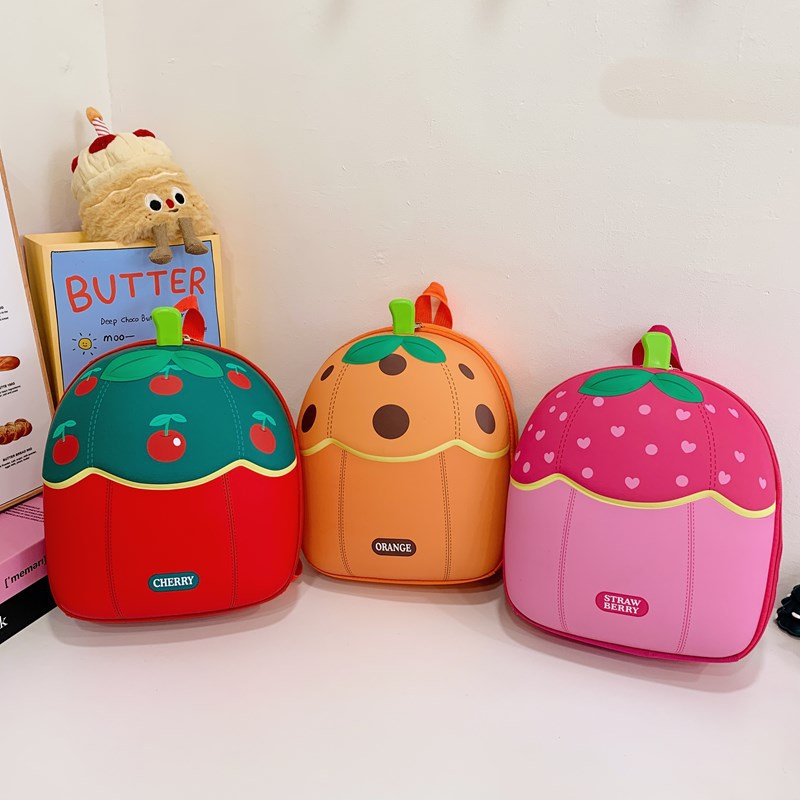 子供の幼稚園の入学のイチゴのケーキのかばんの小さい女の子の男の子の胸は漫画のかわいい小さいクラスの卵の殻のリュックサックを包みます。