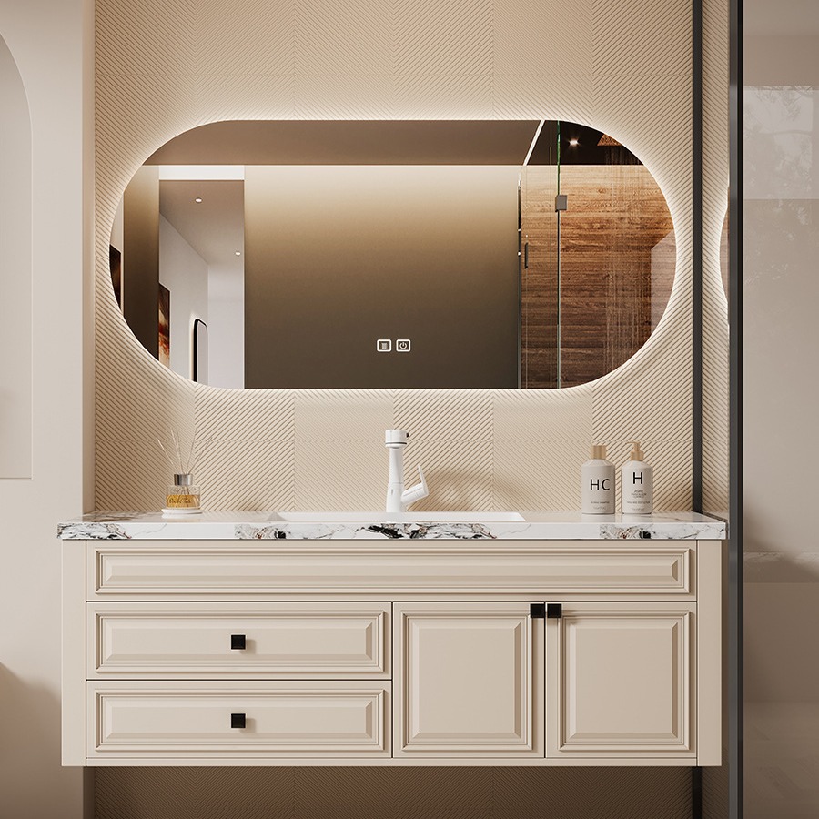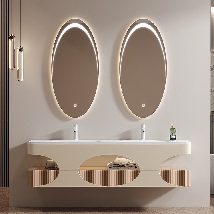 フランス式レトロクリーム風デュポン可丽耐一体盆浴室キャビネットセットオーク材塗装知能丸鏡洗面