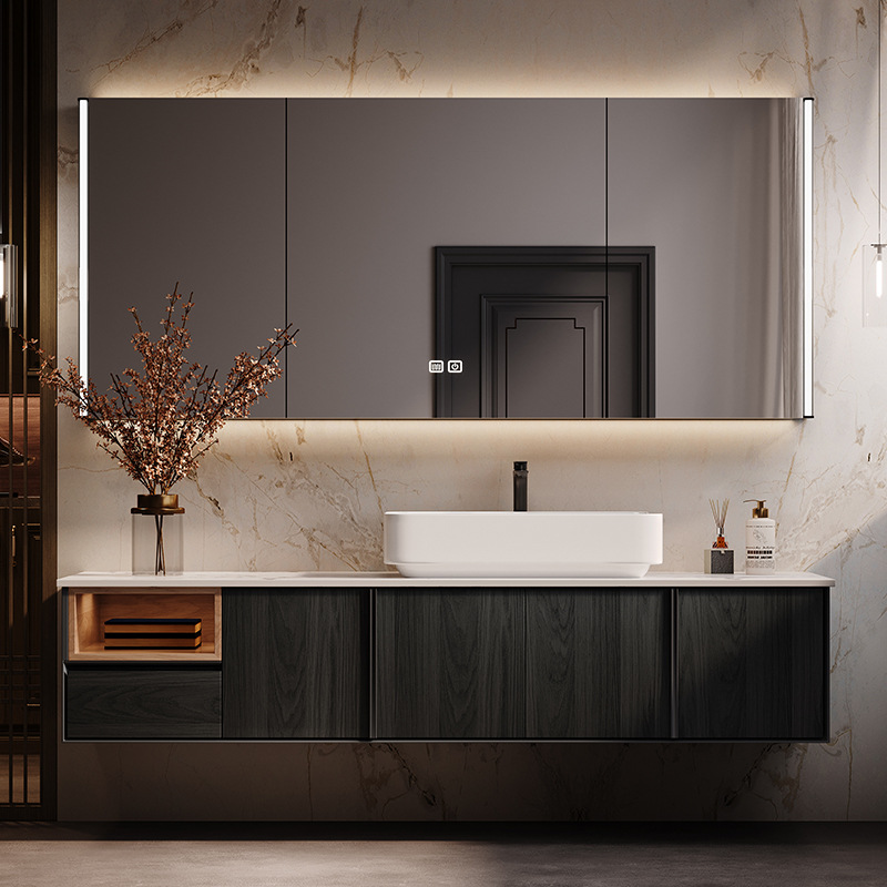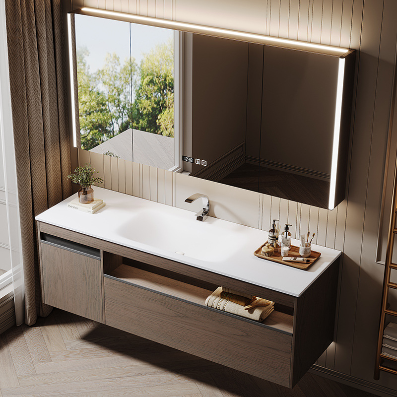 原木風可丽耐一体洗面台浴室キャビネットセットオーク岩板セラミックシームレス洗面器