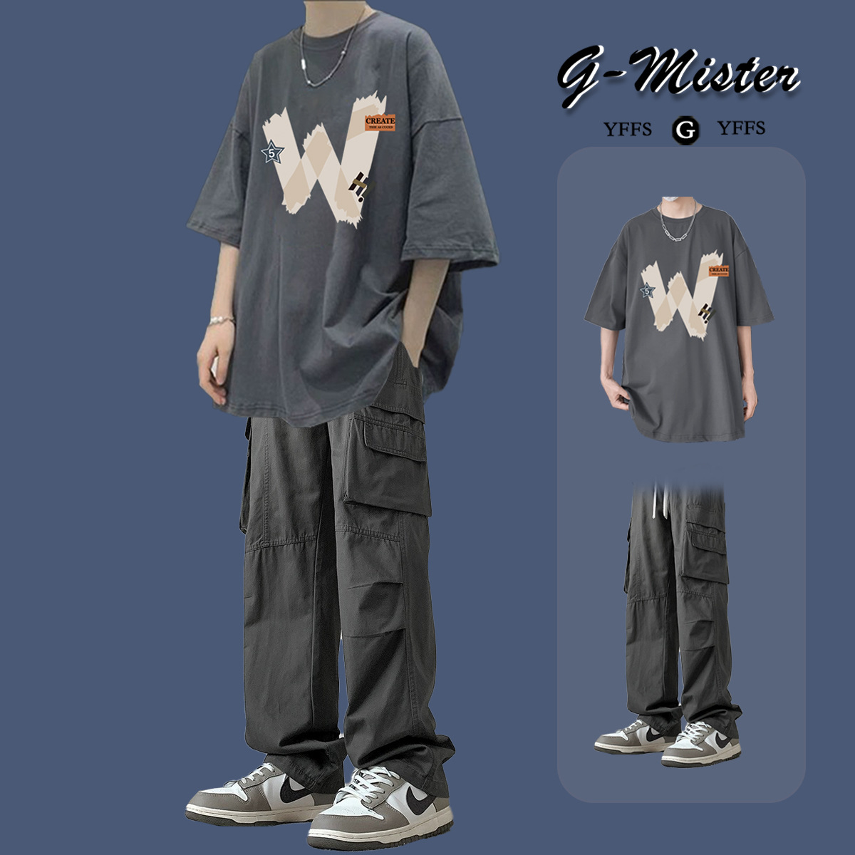 カジュアルスーツメンズ夏薄着デザイン半袖Tシャツトレンドブランドクールでハンサムなオーバーオールのセット