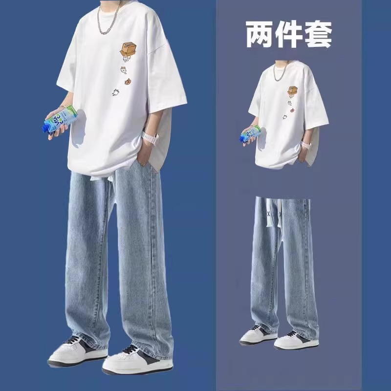 夏の男の子のツーピーススーツ、香港スタイルのゆったりとした半袖Tシャツとストレートジーンズの学生服のセットです。