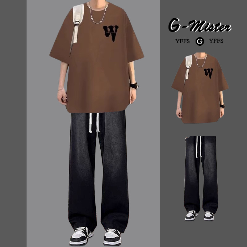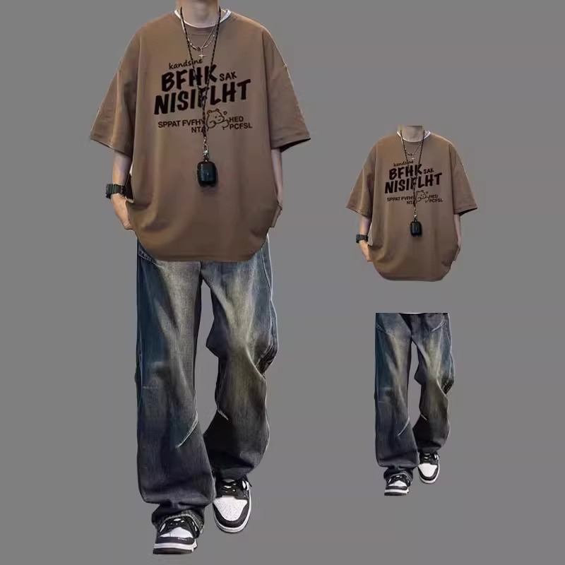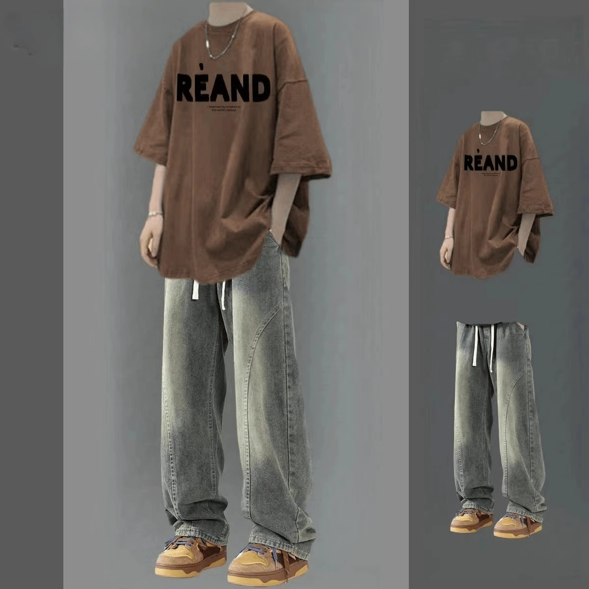男子学生向けの夏用半袖Tシャツスーツ、ハイストリートジーンズとストリートツーピースセットを組み合わせたトレンディでハンサムなセット