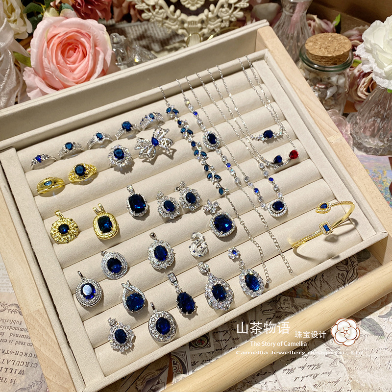 山茶高定ジュエリーデザイン青コランダム彩宝指輪フランス贅沢高級模造天然透輝石指輪