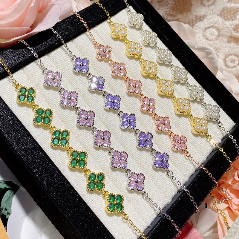 ツバキの韓国式の甘いファッションの精巧な四葉の花のジルコンのブレスレットは18kの金彩の宝の新しい金のドーパミンのブレスレットをめっきします。