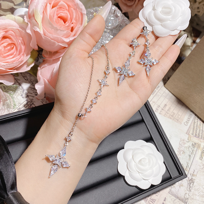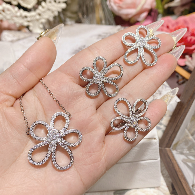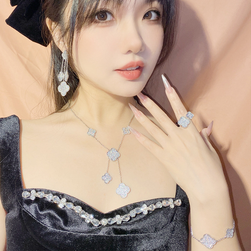 ツバキの欧米の軽い豪華なドリルの大衆の幸運な四つ葉の花のネックレスのピアスのブレスレットの長いタイプのフリンジの精巧なスーツ