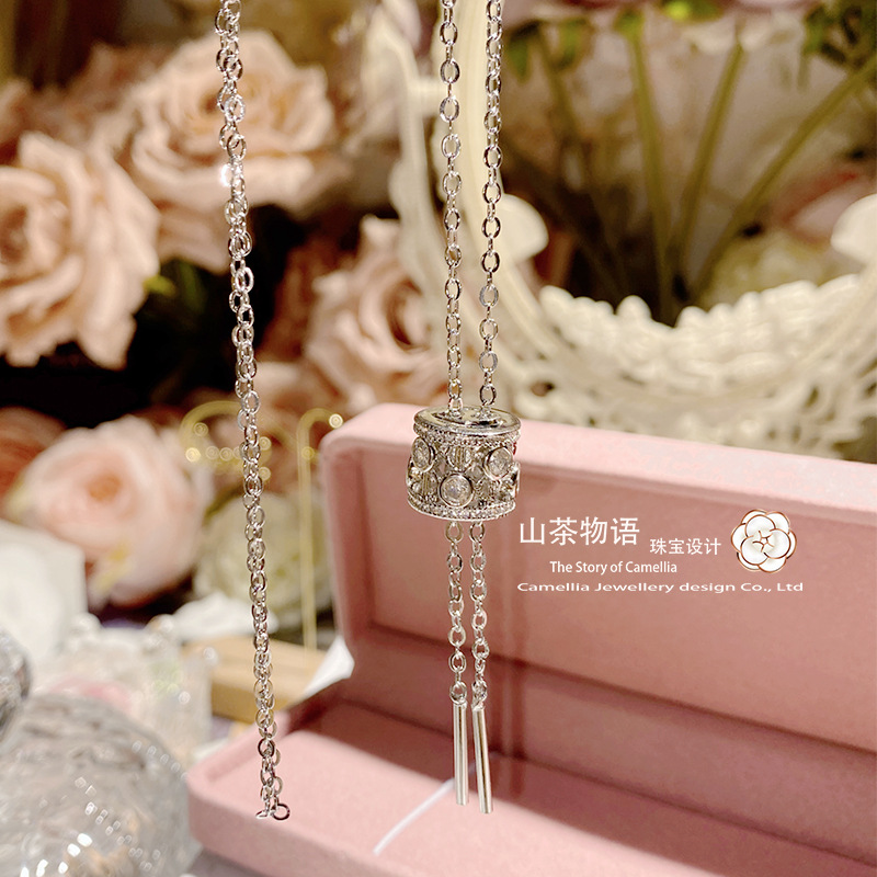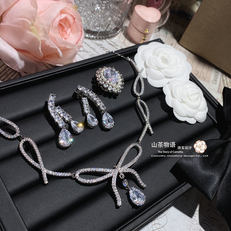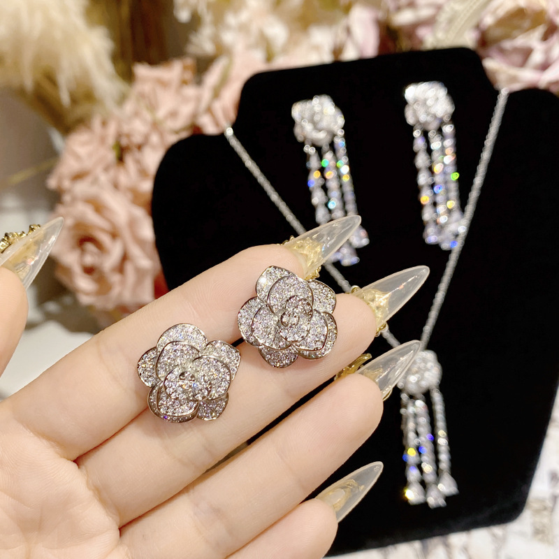 ツバキのストリーマが輝く高級感のある花ins銀針ピアスメッキ18k洗練された優雅な千金宝石セット